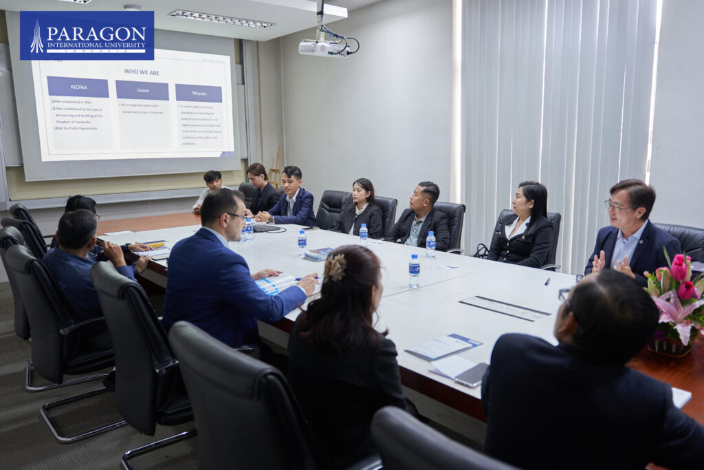 On 4 March 2025 – In a landmark move to strengthen accounting and auditing education in Cambodia, Paragon International University (ParagonIU) and the Kampuchea Institute of Certified Public Accountants and Auditors (KICPAA) signed a Memorandum of Understanding (MoU) under the presence of Dr. Bulat Akhmetkarimov, Rector of ParagonIU, and Ms. Savuth Daly, Executive Director of KICPAA. The signing ceremony was also attended by KICPAA technical officers and representatives from ParagonIU’s Banking and Finance (BAF) Department.